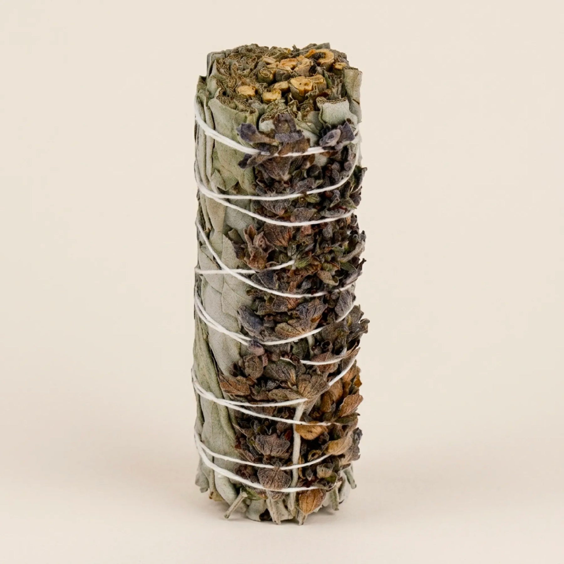 Chaque bâton de 10 cm est composé de Sauge Blanche Salvia Apiana enrichie de fleurs de lavande séchée.
