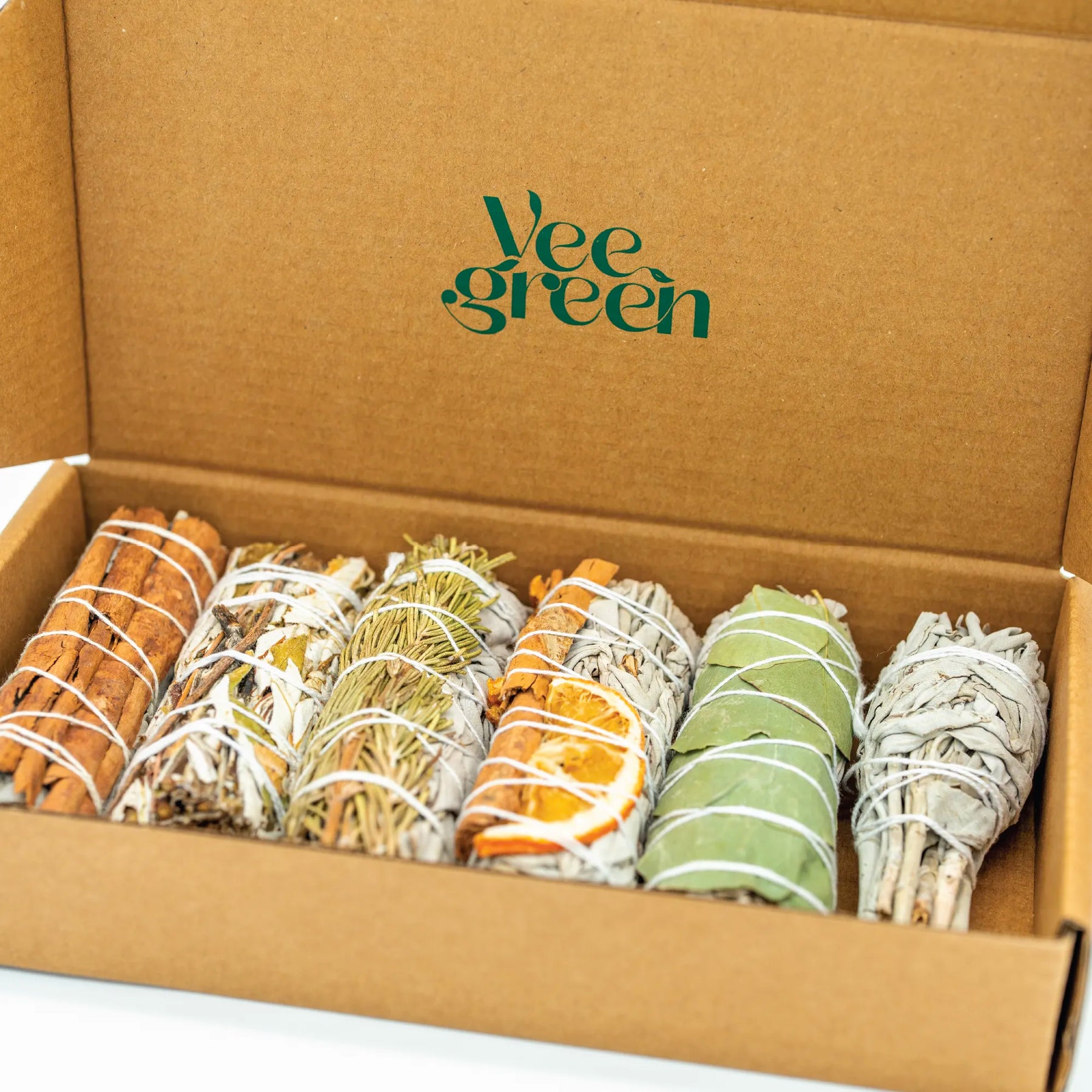 Ce coffret rassemble six fagots d’herbes et d’épices soigneusement sélectionnés : sauge blanche, cannelle, romarin, yerba santa, eucalyptus et orange séchée. Chaque torche dégage une signature olfactive unique ,tantôt boisée, tantôt solaire, pour purifier vos espaces et éveiller les sens.