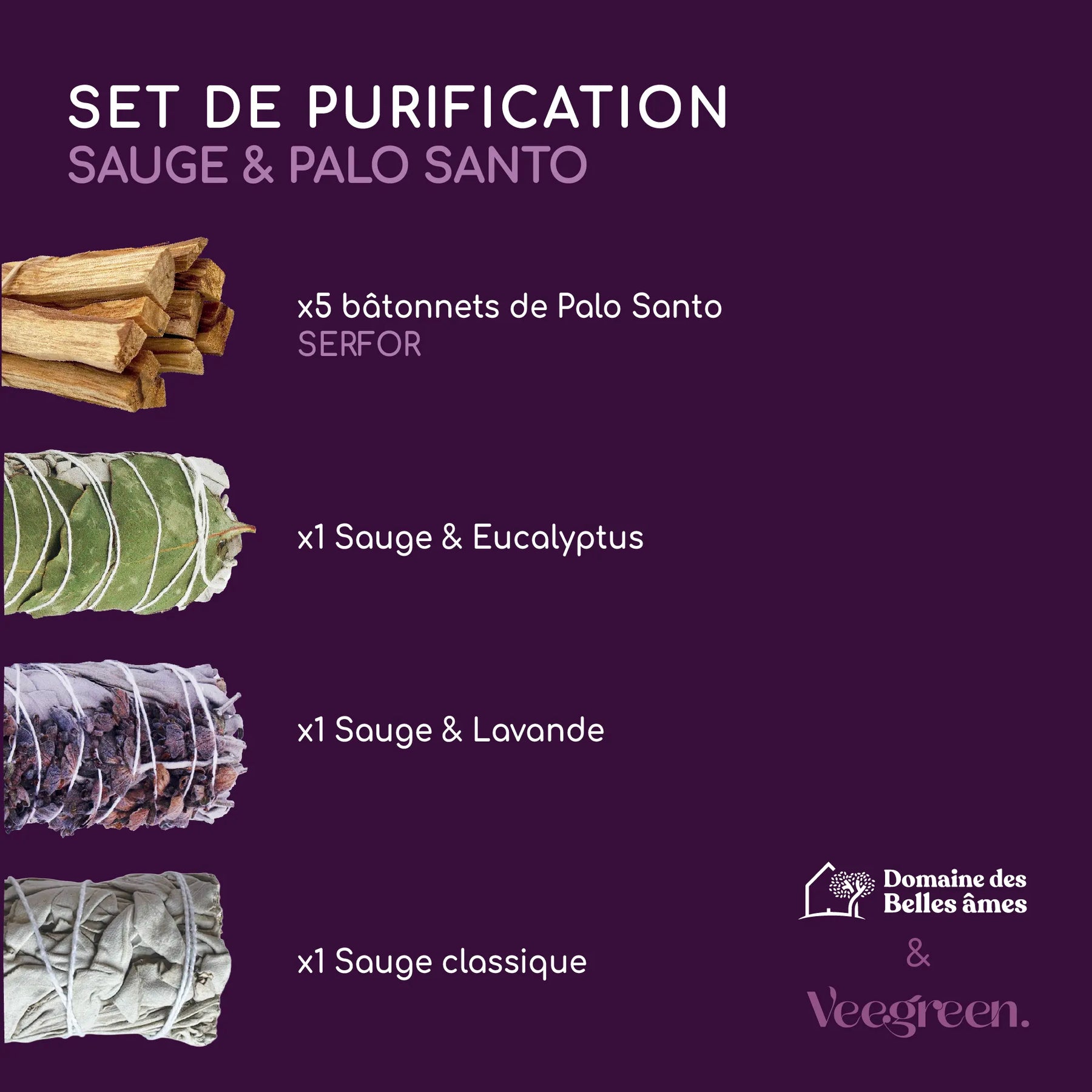 • 3 bâtons de sauge premium + 5 bois de Palo Santo – pour plusieurs moments de rituel