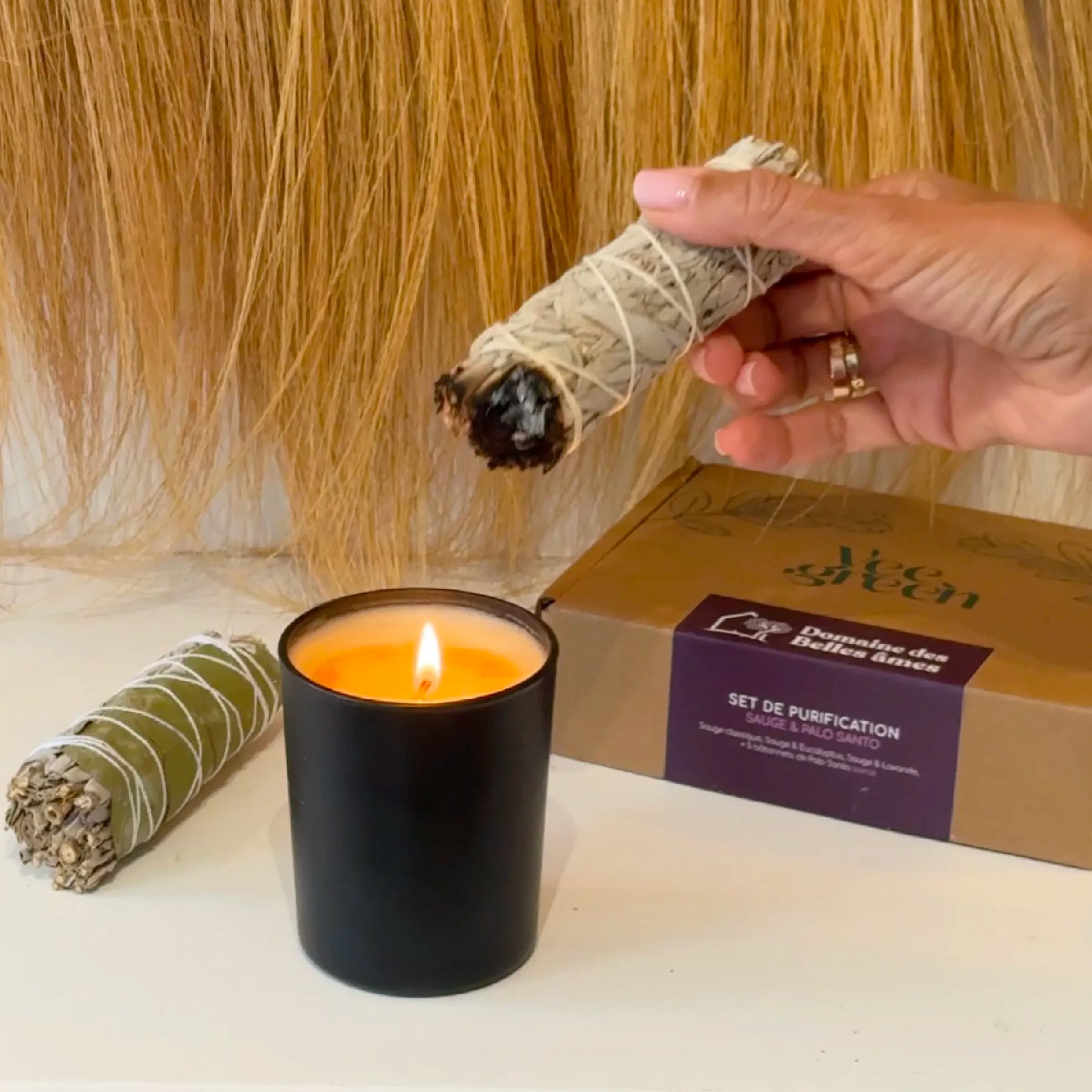 À l’intérieur, un rituel complet composé de 1 Sauge Blanche Classique, 1 Sauge avec Lavande, 1 Sauge avec Eucalyptus et 5 bâtonnets de Palo Santo Bursera Graveolens.